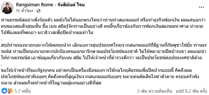นายรังสิมันต์ โรม สส.บัญชีรายชื่อ พรรคประชาชน โพสต์ข้อความผ่านเฟซบุ๊ก กรณีร.อ.ธรรมนัส พรหมเผ่า รองนายกรัฐมนตรีและรัฐมนตรีว่าการกระทรวงเกษตรและสหกรณ์ เตรียมฟ้องร้องปมอภิปรายพาดพิง กล่าวหาเอี่ยวสแกมเมอร์ ว่าท่านธรรมนัสอย่าเพิ่งร้อนตัว ผมยังไม่ได้บอกตรงไหนว่าท่านทำสแกมเมอร์