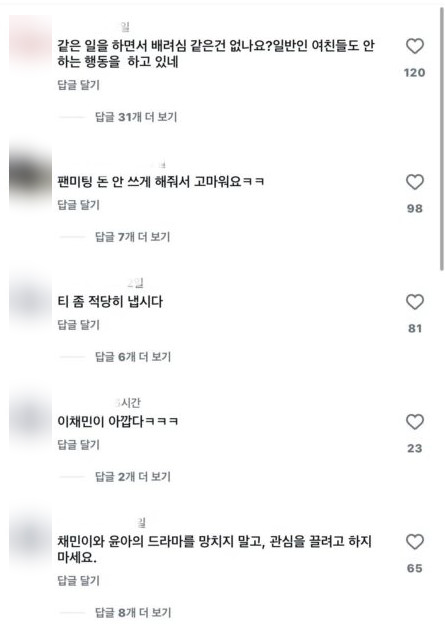 เพราะหลังจากที่ รยูดาอิน โพสต์รูปเค้กคู่อีแชมินก็ทำให้มีชาวเน็ตบางกลุ่มโจมตีและมีการคอมเมนต์ตำหนิ อาทิ เธอก็ทำงานในวงการเหมือนกัน ทำไมถึงไม่มีจิตสำนึกเลย? แฟนคนธรรมดายังรู้มารยาทมากกว่านี้อีก.. , ขอบใจนะที่ทำให้ฉันไม่ต้องเสียเงินไปงานแฟนมีตของเขา 555