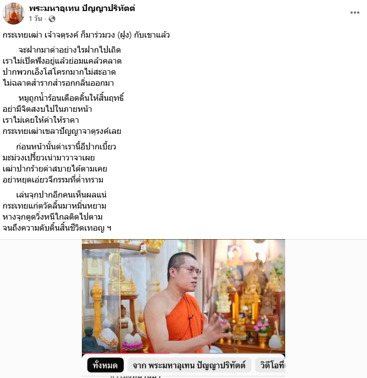 จากกรณีพระมหาอุเทน ปัญญาปริทัตต์ ออกมาโพสต์คำกลอนด่า อาจารย์จตุรงค์ จงอาษา นักวิชาการด้านศาสนาและไสยศาสตร์ ว่า “กระเทยเฒ่า เจ้าจตุรงค์ ก็มาร่วมวง (ฝูง) กับเขาแล้วจะฝากมาด่าอย่างไรฝากไปเถิดเราไม่เปิดฟังอยู่แล้วย่อมแคล้วคลาดปากพวกเอ็งโสโครกมากไม่สะอาด