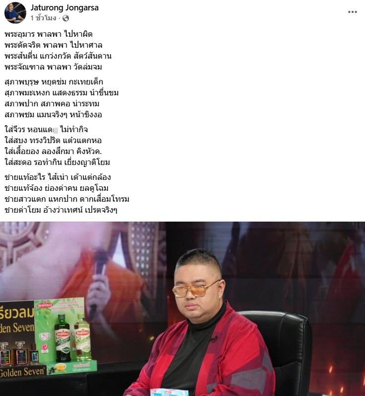 ใส่สะดอ รอทำกิน เยี่ยงญาติโยม ชายแท้อะไร ไส้เน่า เด้าแต่กล้อง ชายแท้จ้อง ย่องด่าคน ยลดูโฉม ชายสาวแตก แหกปาก ดากเสื่อมโทรม ชายด่าโยม อ้างว่าเทศน์ เปรตจริงๆ