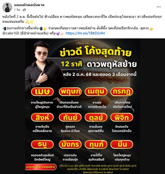 รีบเช็กดวงชะตาของคุณเลย หมอเค้กดลบันดาล หมอดู-นักพยากรณ์ชื่อดัง ได้ออกมาเปิดคำทำนายแล้ว หลังวันที่ 2 ต.ค. นี้เป็นต้นไป ฟ้าเปลี่ยน ดาวพฤหัสหนุน เสริมดวงทุกชีวิต เปิดประตูโชคชะตา ข่าวดีหล่นทับทุกคนแน่นอน