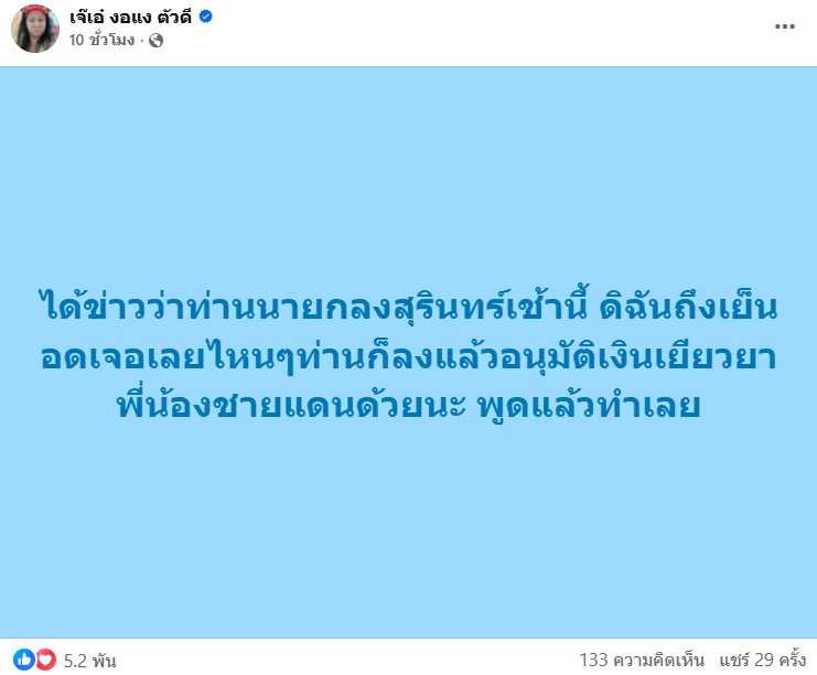 โดย เจ๊เอ๋ ระบุว่า “ได้ข่าวว่าท่านนายกลงสุรินทร์เช้านี้ ดิฉันถึงเย็นอดเจอเลย ไหนๆท่านก็ลงแล้ว อนุมัติเงินเยียวยาพี่น้องชายแดนด้วยนะ พูดแล้วทำเลย”