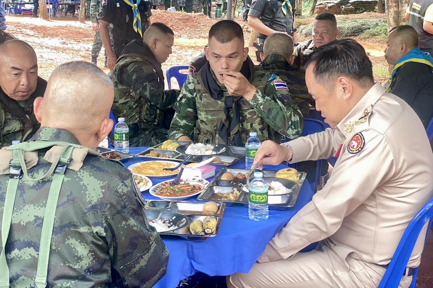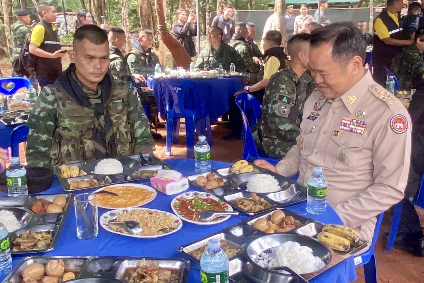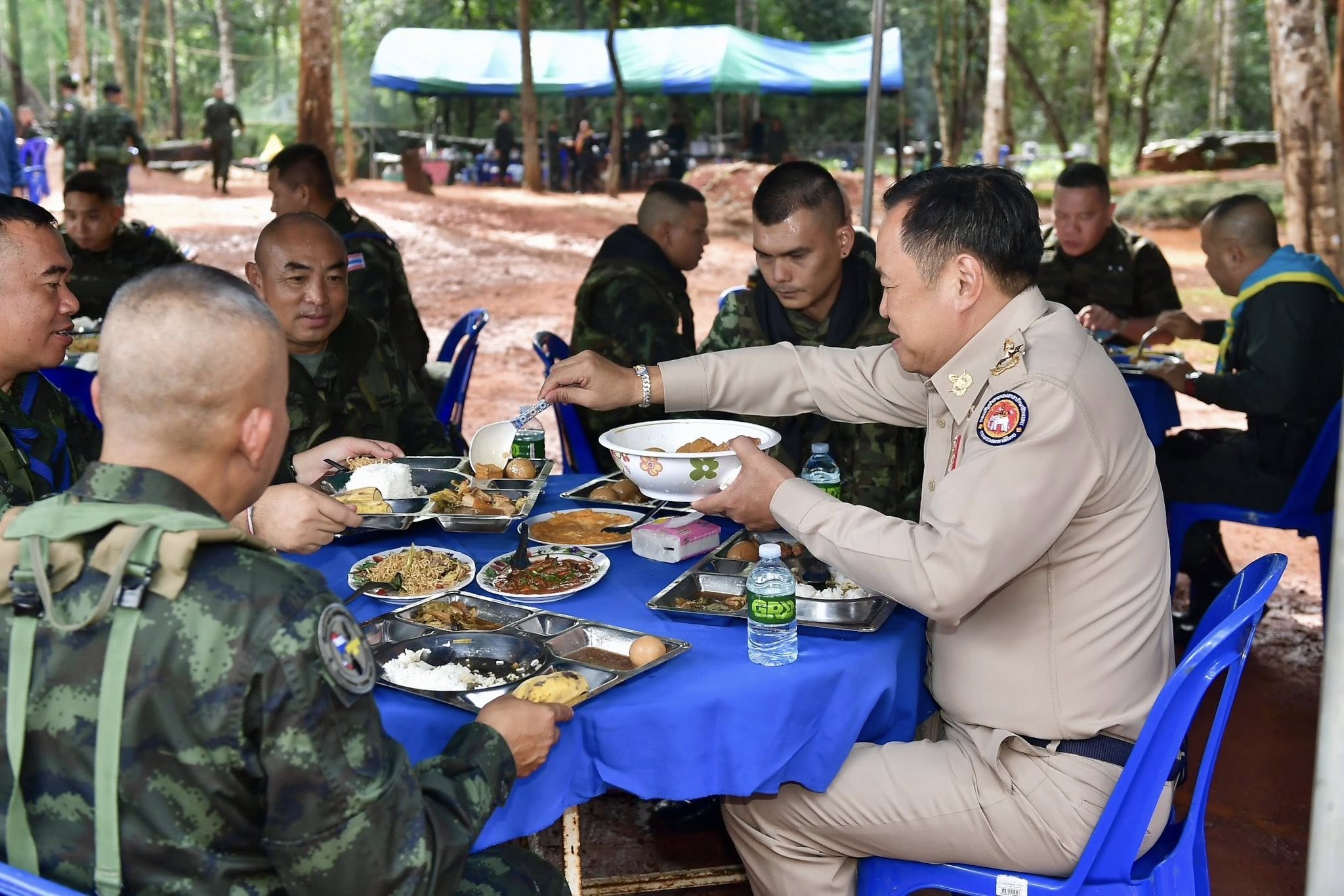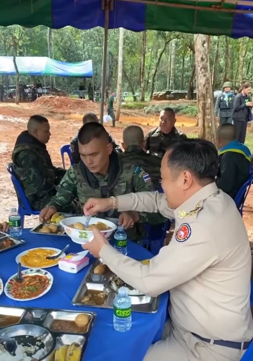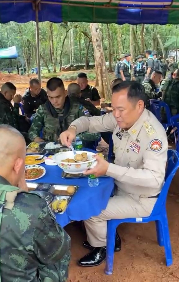 เพื่อให้พวกท่านได้กลับบ้านโดยเร็ว และนำพาชัยชนะอธิปไตยไทยของเราไปฝากประชาชน ” นายอนุทิน กล่าว จากนั้น นายกรัฐมนตรี ได้ร่วมรับประทานอาหารกลางวันกับกำลังพลในพื้นที่ โดยได้ตักพะโล้ให้กับเจ้าหน้าที่ทหารก่อนรับประทานอาหารในถาดหลุมร่วมกันด้วย