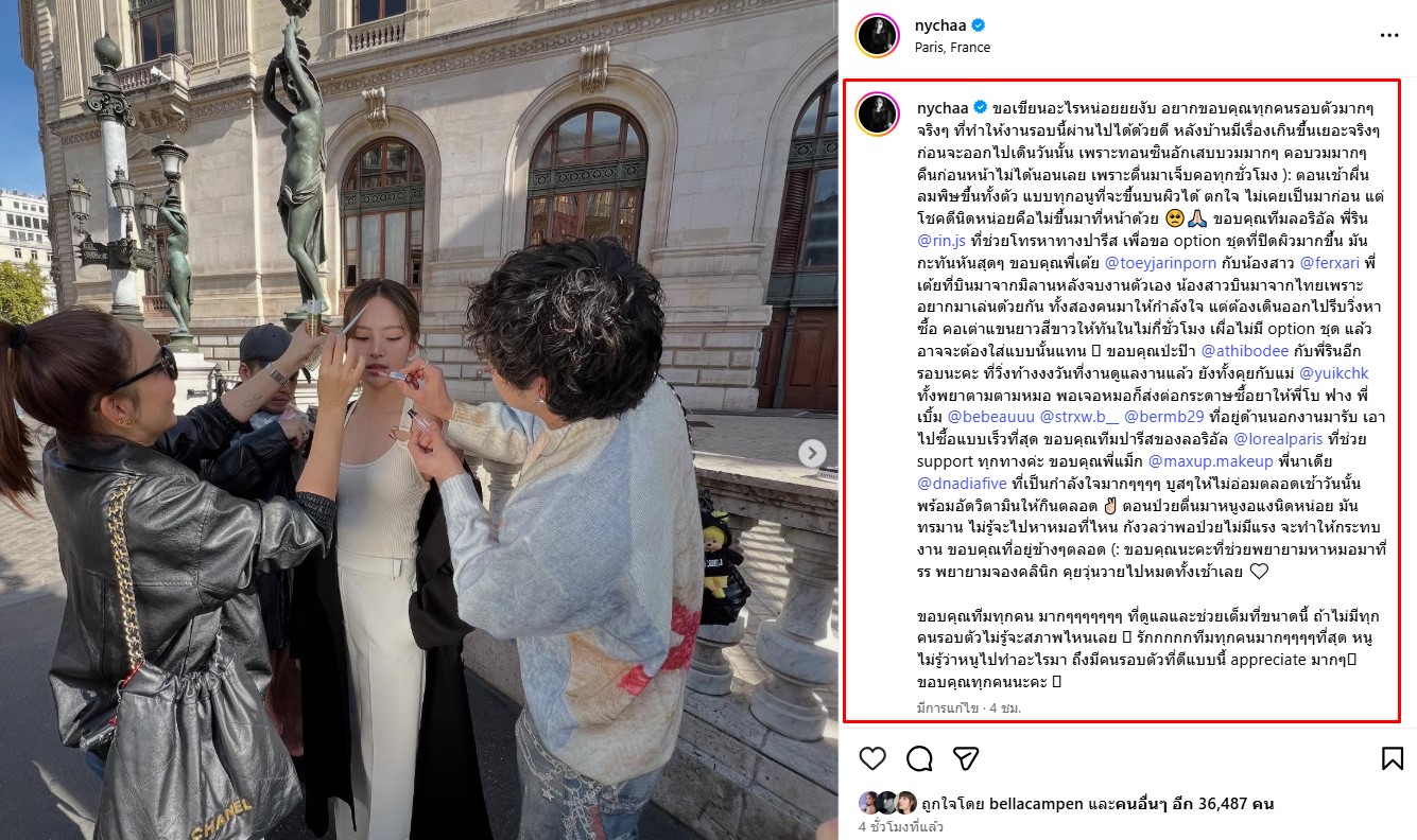 โดย ณิชา ออกมาเผยว่า “ขอเขียนอะไรหน่อยยยงับ อยากขอบคุณทุกคนรอบตัวมากๆจริงๆ ที่ทำให้งานรอบนี้ผ่านไปได้ด้วยดี หลังบ้านมีเรื่องเกิดขึ้นเยอะจริงๆก่อนจะออกไปเดินวันนั้น เพราะทอนซินอักเสบบวมมากๆ คอบวมมากๆ คืนก่อนหน้าไม่ได้นอนเลย เพราะตื่นมาเจ็บคอทุกชั่วโมง ): ตอนเช้าผื่นลมพิษขึ้นทั้งตัว แบบทุกอณูที่จะขึ้นบนผิวได้ ตกใจ ไม่เคยเป็นมาก่อน