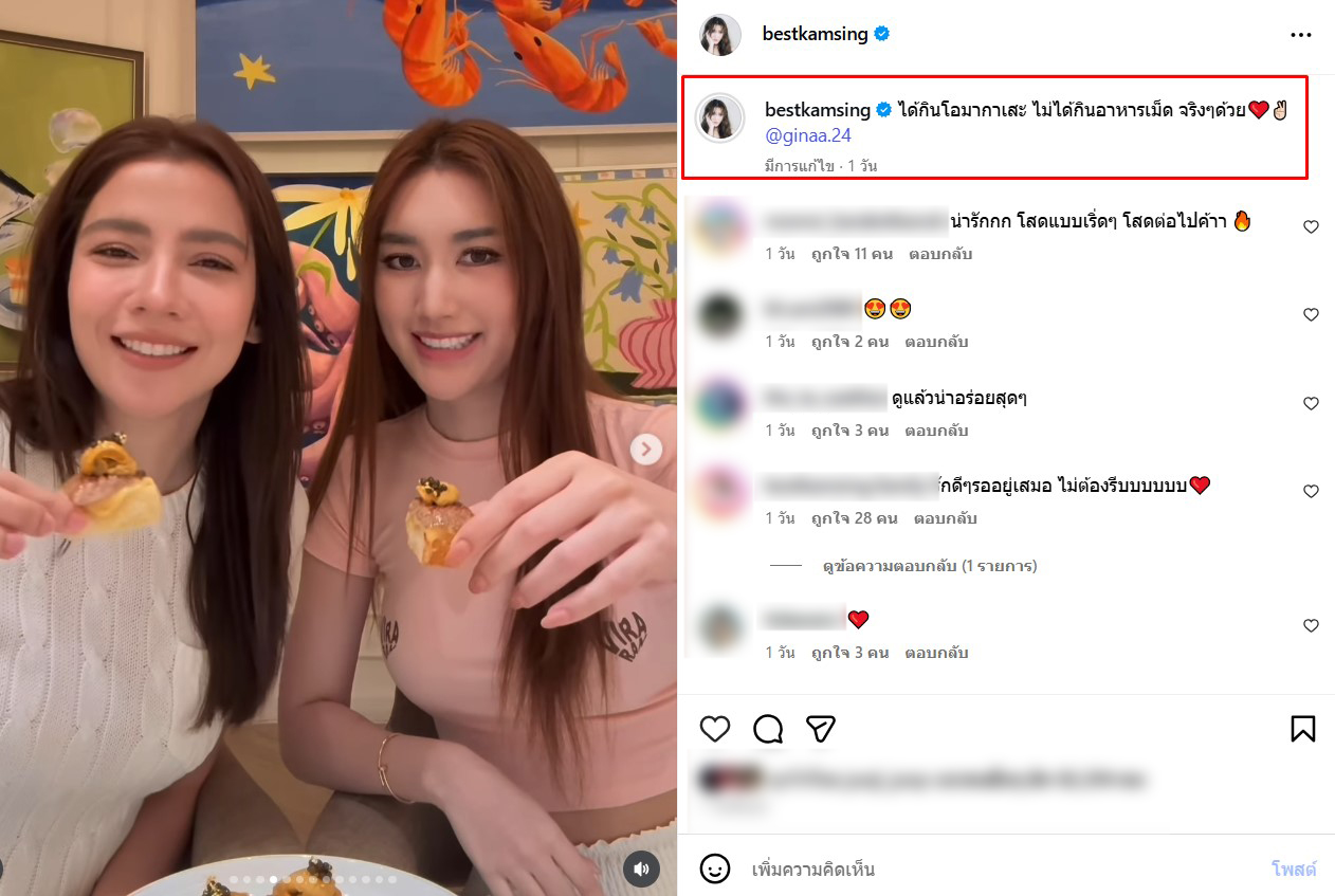 โดย เบส ได้โพสต์ภาพคู่พร้อมลงแคปชั่นว่า “ได้กินโอมากาเสะ ไม่ได้กินอาหารเม็ด จริงๆด้วย❤️✌🏻 @ginaa.24”